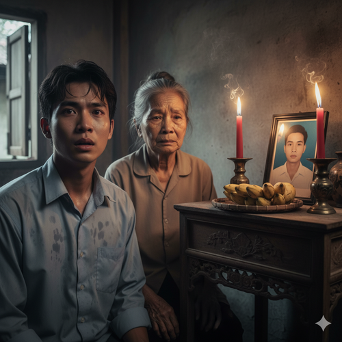 Hùng cảm ơn rối rít, bước vào ngôi nhà nhỏ đơn sơ. Mùi củi cháy xen lẫn hương thảo mộc thoang thoảng khiến anh thấy ấm lòng sau cả ngày mệt mỏi. Trong ánh lửa lập lòe, anh nhìn thấy một bàn thờ nhỏ đặt ngay góc phòng. Trên bàn thờ là bức ảnh đen trắng của một cậu bé chừng năm tuổi, nụ cười trong veo, đôi mắt sáng ngời — và điều khiến Hùng chết lặng: cậu bé ấy giống anh như hai giọt nước.