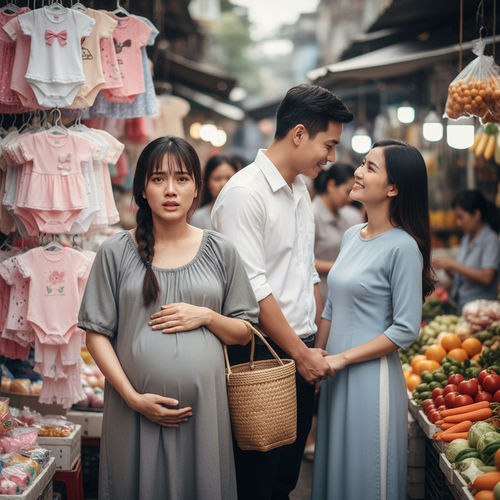 Hương đứng chết trân như hóa đá. Cô không dám bước tới. Chỉ nhìn từ xa, đủ để thấy rõ cái dáng thân thuộc của người chồng đầu ấp tay gối, giờ đây đang dịu dàng chăm chút cho một người đàn bà khác – trong khi vợ sắp sinh lại phải tự đi chợ một mình.