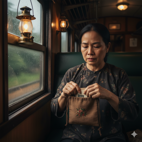 Ở sân ga, tiếng loa phóng thanh khàn đặc, mùi khói sắt lạnh và mùi bắp luộc chen chúc. Tôi ôm túi vải, ôm luôn mớ suy nghĩ còn lộn xộn như lòng chảo vừa nhấc xuống bếp. Tàu chậm hai mươi phút. Tôi ngồi trên băng ghế chờ, lòng lẩm bẩm: “Mình mong gì đây? Người ta trẻ, người ta còn lo đủ thứ. Năm trăm nghìn cũng là tấm lòng.” Tự nhủ vậy mà cục nghèn nghẹn vẫn không tan.