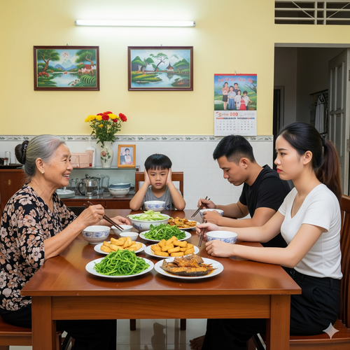 Tôi run lên khi thấy con trai mình mon men lại gần, xin một miếng gà, thì bị bà quát mắng, đẩy ra. Nỗi uất nghẹn tràn ngập trong tim. Tiền tôi gửi với lòng hiếu thảo đã biến thành những bữa tiệc riêng của mẹ chồng, trong khi cả nhà ăn cơm nguội, con tôi thì tủi thân.